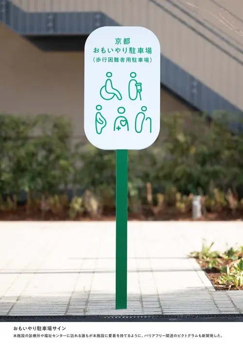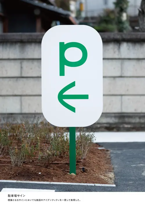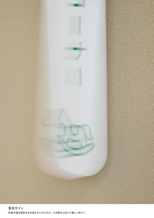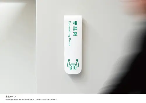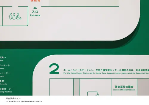 作品意図本施設が位置する和束町はお茶の一大生産地である。立ちこめる霧は茶畑を優しく包み込み、芳醇な香りを持つ特有のお茶を生む。本施設が和束の霧のように町民を優しく包み、身近な存在になるように「霧と茶畑」をデザインコンセプトに据えた。柔らかく優しい形の室名サインは町民の動きに呼応して霧のように揺らぐ。案内サインは白と緑のレイヤー構造を茶畑と霧に見立て、和束の風景を抽象的に表現した。
