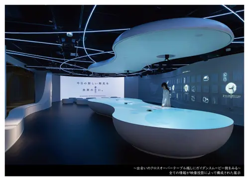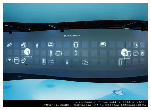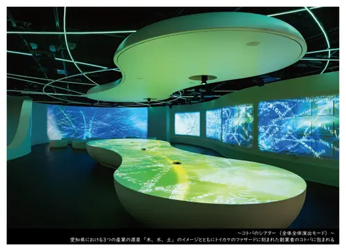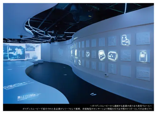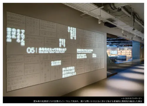 作品意図あいち創業館は起業家や子ども達の創造力や出会いを育む展示施設です。 展示としての膨大な情報提供と更新性を担保しつつ、本施設に拠点を構える起業家たちの交流の場となることを両立させる為に、 言葉のレリーフや各企業の創業を象徴するイメージレリーフをベースに、全ての情報をデジタルで展開する展示とした。レリーフは内装のテクスチャとなり、映像化されたグラフィックと共に空間を彩る二面性のある空間を目指した。