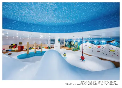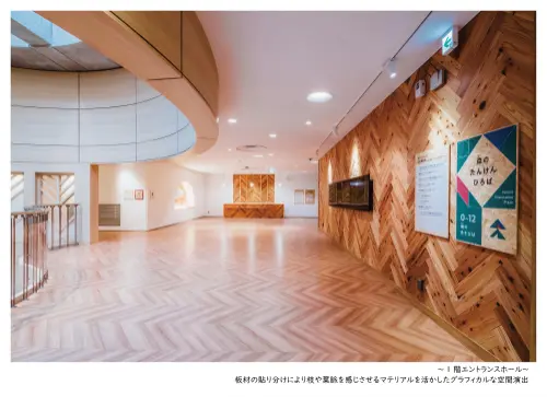 作品意図自然・動物・科学をテーマに個性や年齢に応じた遊びを通して子供達が生きる力を育む場であり、保護者も癒される公園のような場。屋外から屋内へとシームレスに展開する視覚的な仕掛けにより来館者を館内に優しく誘引。長野の風景を想像させるアトラクティブなオリジナル遊具と、色彩・素材・光が織りなすグラフィカルな演出が融合した体験空間を通して、幼少期の遊びを通して地域の原風景や自然に気付きを与える場を目指した。