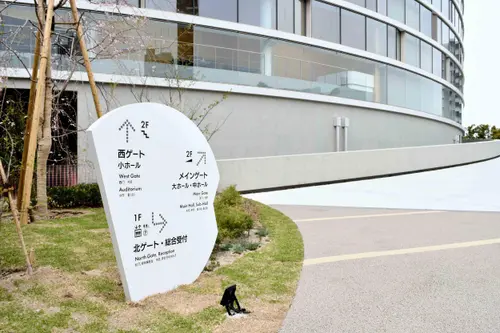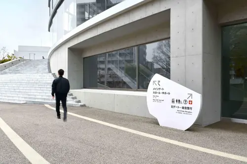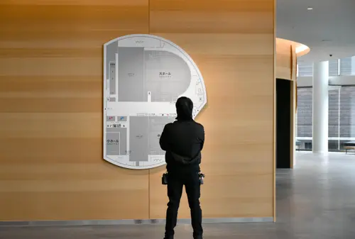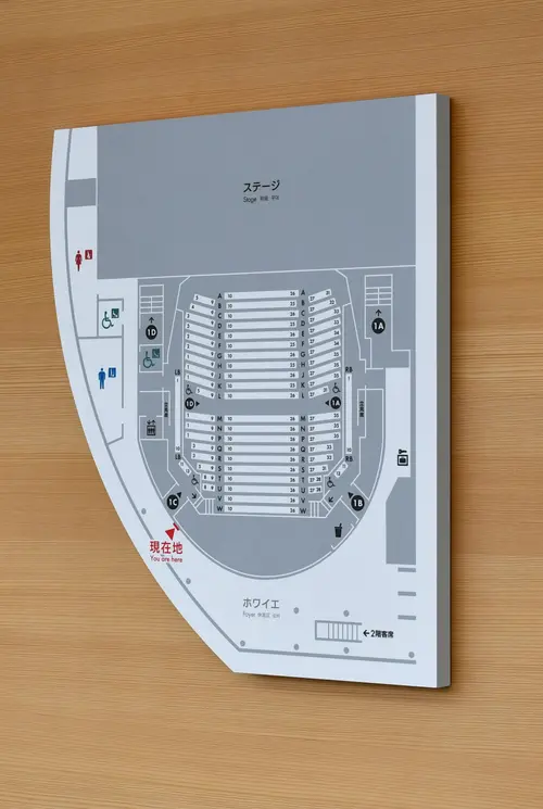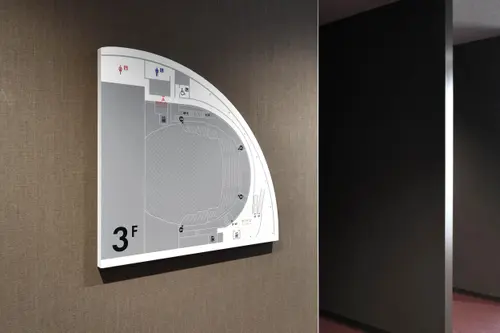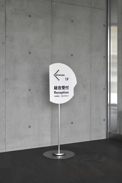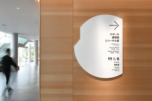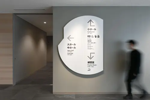 作品意図老朽化した既存の福岡市民会館に代わり、福岡の新たな文化振興の拠点として新築された福岡市民ホール。公園に向けて円形に配置されたその象徴的な平面形状をモチーフに、サイン計画を行った。一部を切り取った円形の表示板は、設置場所と建物との位置関係に応じて回転させるように角度を調整。これにより、利用者が今どちらを向いているかを直感的に把握できるように配慮している。
