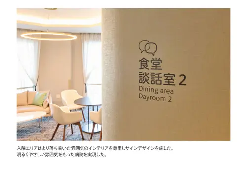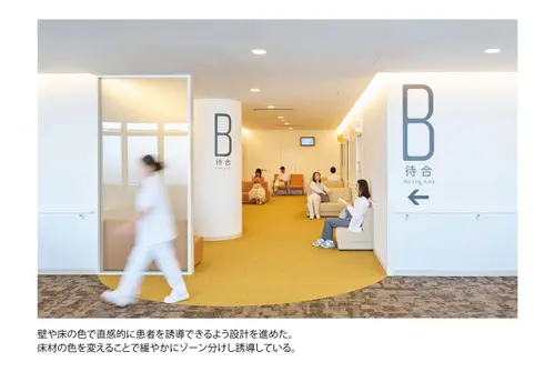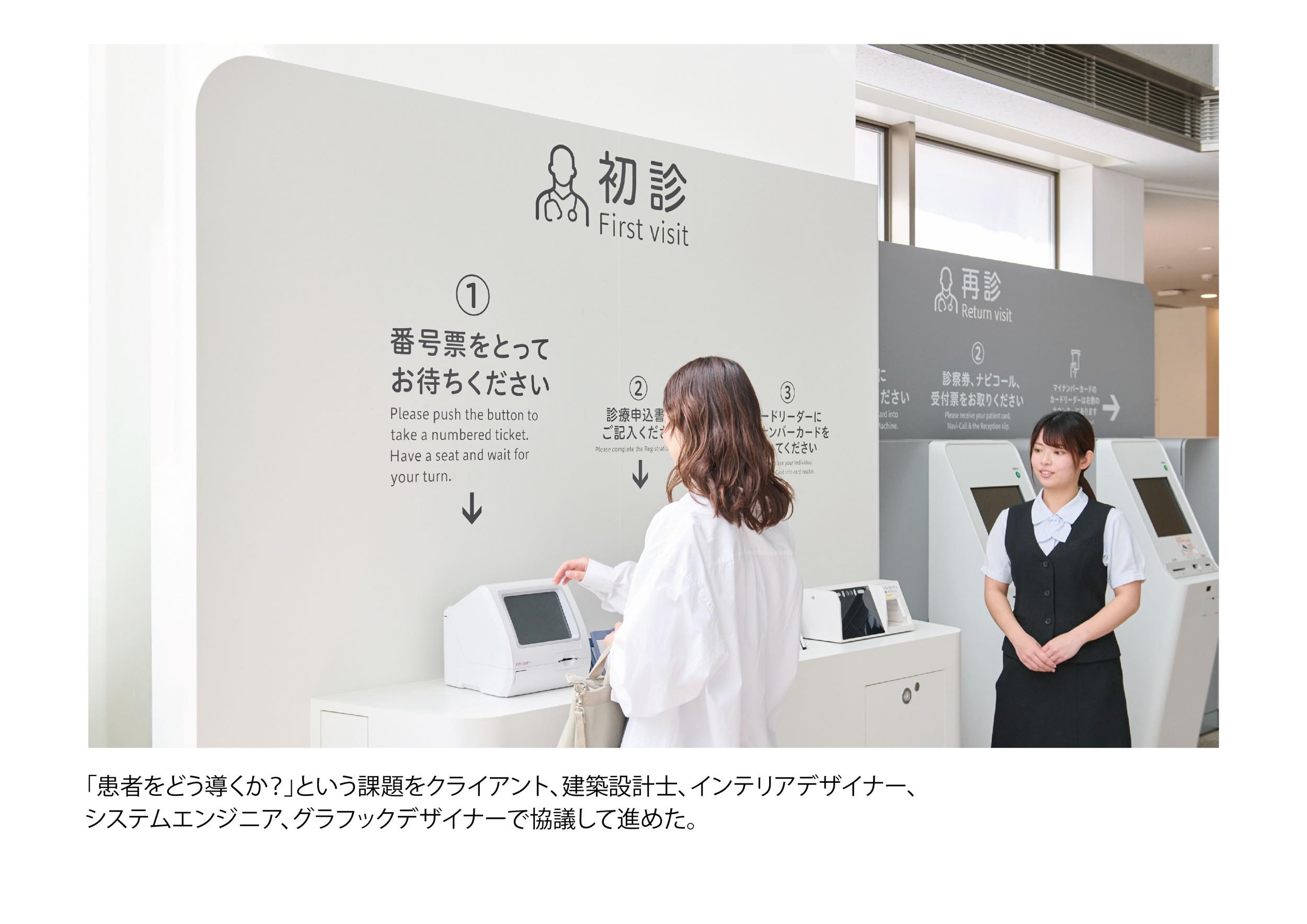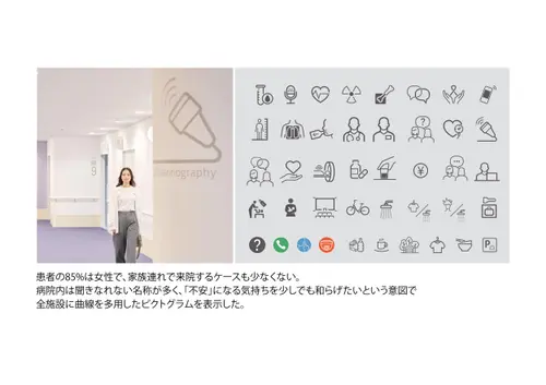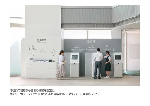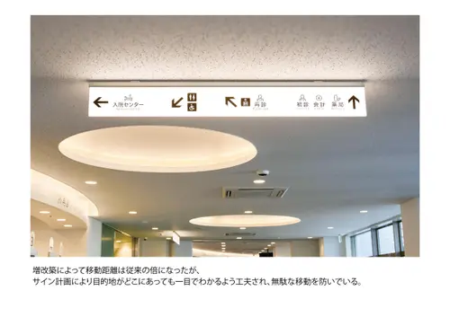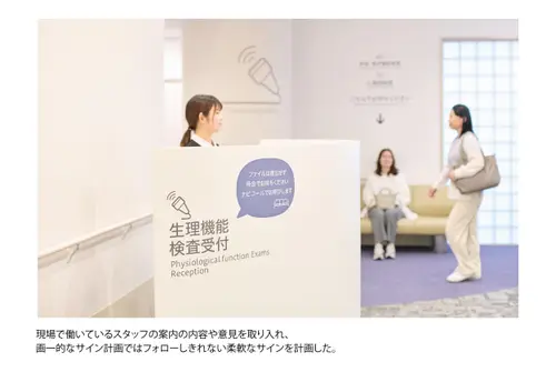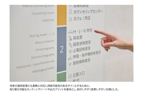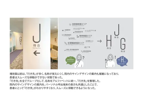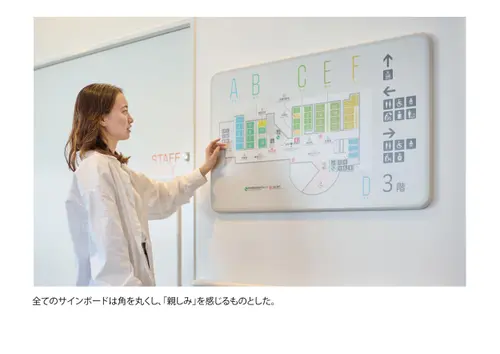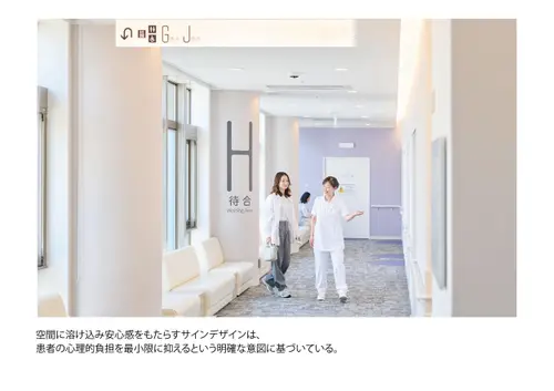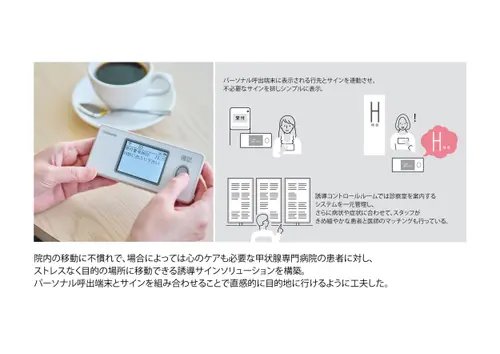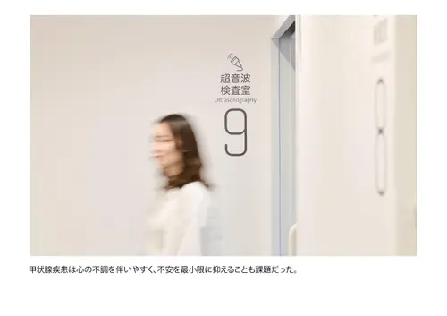 作品意図院内の移動に不慣れで、場合によっては心のケアも必要な甲状腺専門病院の患者に対し、ストレスなく目的の場所に移動できる誘導サインソリューションを構築。病院の増改築に合わせて、サインデザイン×インテリアデザイン×DXを全面的に見直し、統合的に運用することでスムーズな移動と心地よい待機時間を両立させ患者満足度の向上を実現した。