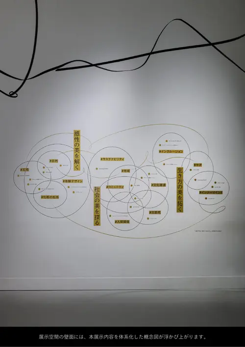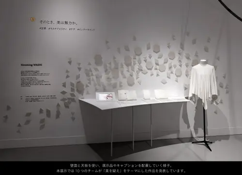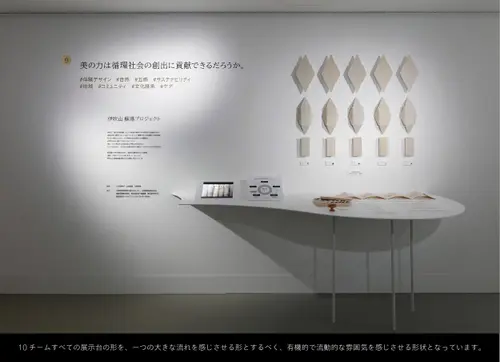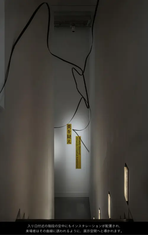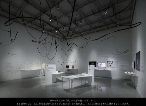 作品意図天井に配置された曲線のインスタレーションをある視点から見ると「美」の文字が浮かび上がります。様々な視点から見つめることで、ある箇所からは「美」、別の箇所からはそうではないという体験を通して、美とは何かを考える展示となっています。展示台では資生堂クリエイティブの10つのチームが「美を疑え」をテーマにした作品を発表しています。美の概念が広がり、明日からの世界が少しだけ違って見える展示となっています。