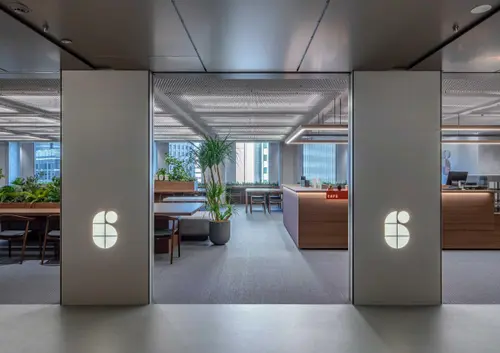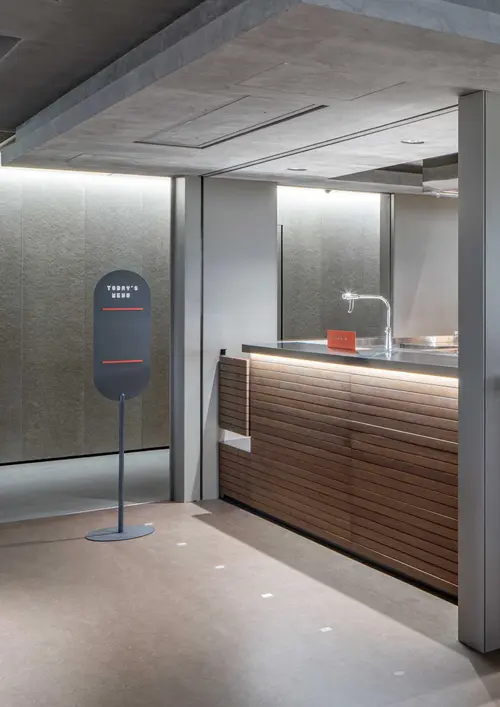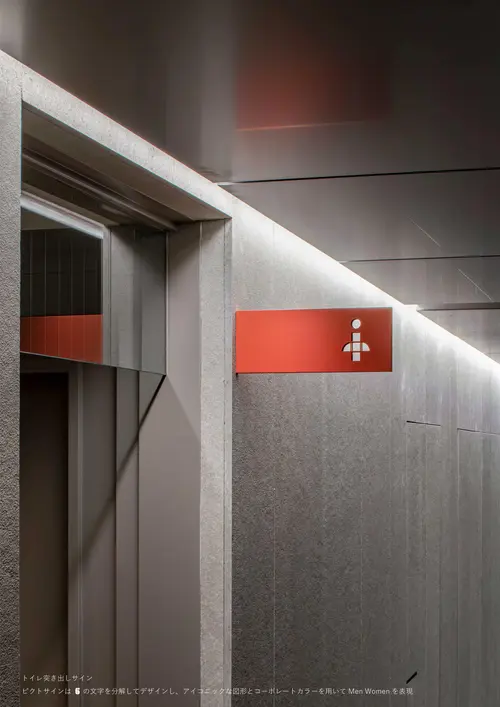 作品意図大成建設スローガン「人がいきいきとする環境を創造する」ために、自らがいきいきと働く。その環境実現に向け全社的に利用可能な食事もできるワークプレイスを整備した。改修前の愛着あるネーミングの6階、全社員が集まれるコモンフロア6F、ひと繋がりの空間に多様な働き方を促す6エリア、これらを象徴するように6つの幾何学で構成されたサインをデザインし、機能や用途により素材や色、形を変え個性ある表情を生み出した。