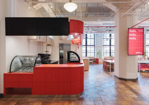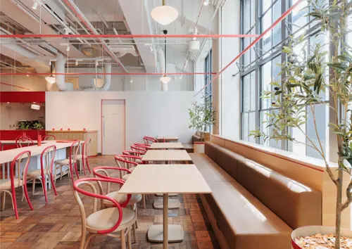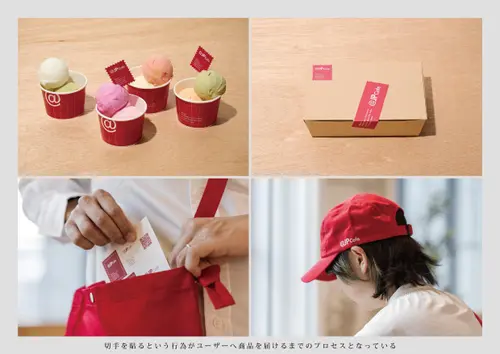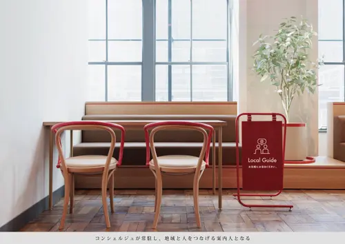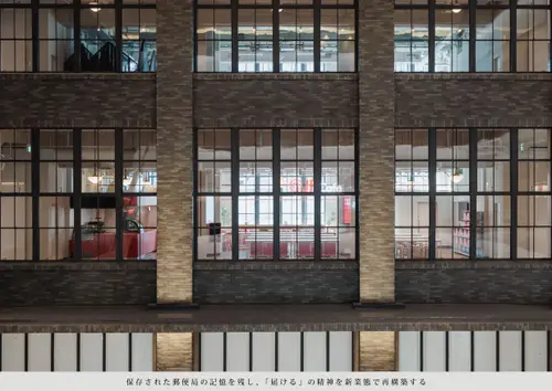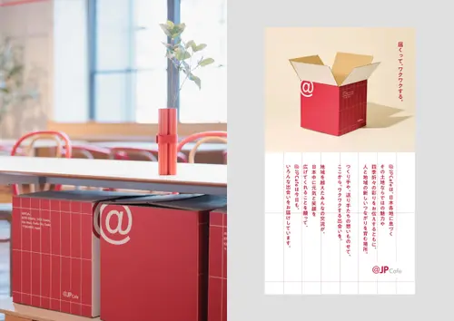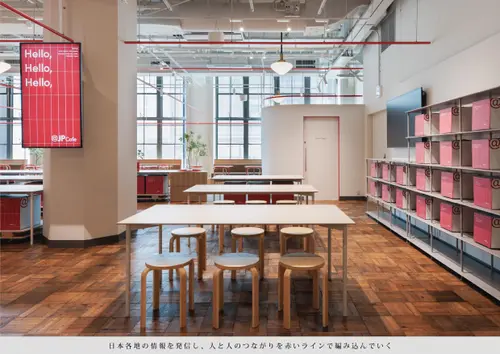 作品意図ここは旧大阪中央郵便局舎の一部を保存・移設の上商業施設の一部として一体的に活用した区画である。日本各地に息づくその土地ならではの魅力や四季折々の彩りをお伝えするとともに人と地域の新しいつながりを育む場所。この場所がかつて郵便という人から人へモノや想いを届けていた背景を引継ぎ、「編む」をコンセプトにした赤いラインとダンボールを用いることで保存された過去の記憶と新たな要素の同期を図った。