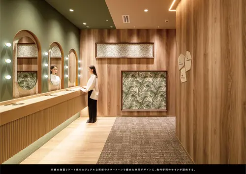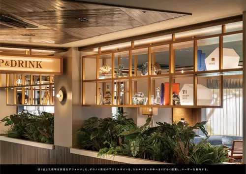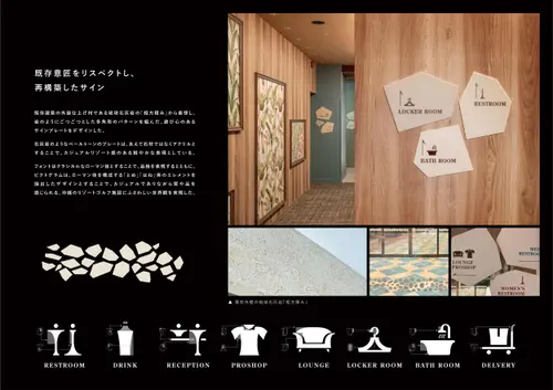 作品意図「オキナワリゾート」を前面に打ち出しつつも、若年層向けにカジュアル感を意識したゴルフクラブハウス改修計画である。 この空間の中にあるべきサインとして、カジュアルでありつつも品格が必要であったため、クラシカルな書体と、フォントのディティールから抽出したピクトグラムを計画した。 サインプレートは琉球石灰岩の代表的な積み方である「相方積み」から着想し、石灰色のカラーアクリルをリズムよく配置している。