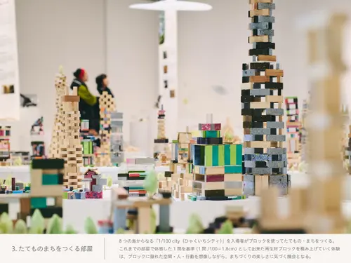 作品意図「縮尺:スケール」を切り口に、建築やまちづくりの魅力を体感できる展覧会。1間=1.82mを基準として、1/1の実物サイズに入り込み、1/10~1/1000でのぞきこみ、1/100で手のひらサイズになった再生材ブロックを積み上げ、たてもの・まちをつくりあげていく。この身体を通したスケールの行き来によって想像力を働かせ、「たてもの・まちの新しい見方(=たてものめがね・まちめがね)」の発見を促す。