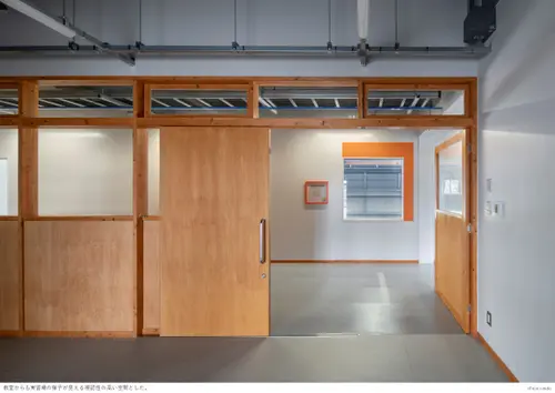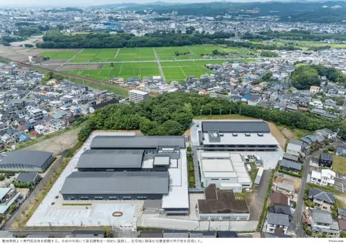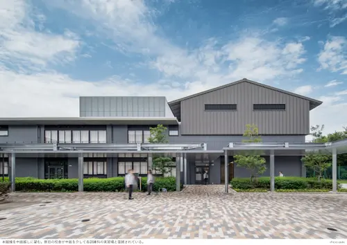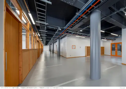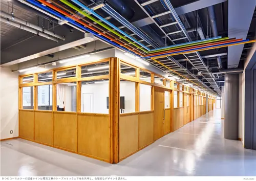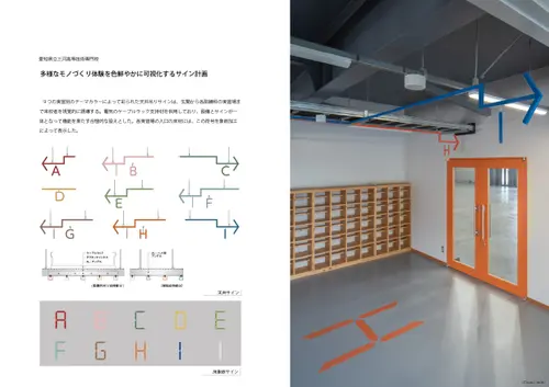 作品意図本計画は愛知県内の高等技術専門校を再編し、モノづくり人材育成の拠点として8つの訓練科と人材開発センターを1か所に整備するものである。 建築自体をモノづくり学習教材として計画し、9つの実習科目別にテーマカラーを割り当てた。 この学び舎を使う訓練生がモノトーンの空間を彩る天井吊りサイン、床象嵌加工サイン、説明サインに誘導されて9つのモノづくり空間を体験し、刺激し合いながら切磋琢磨することを目指した