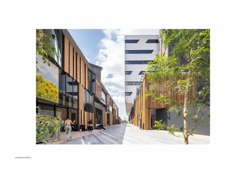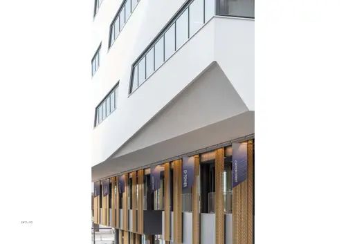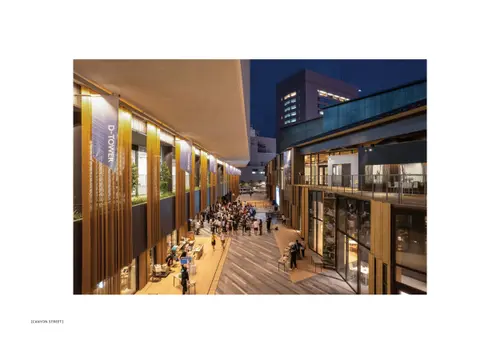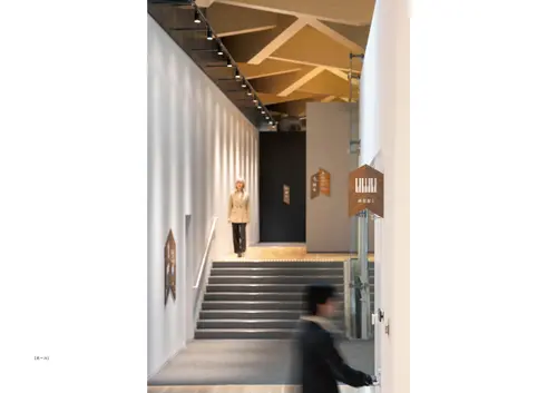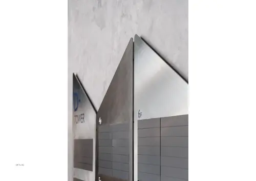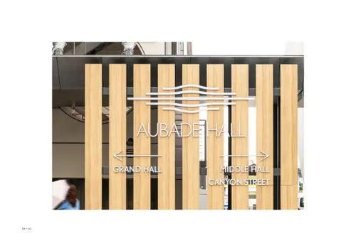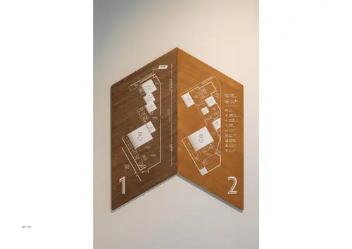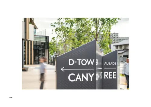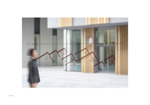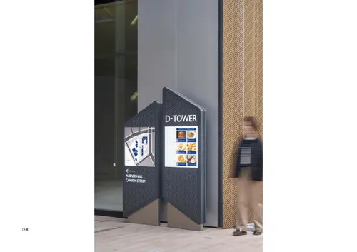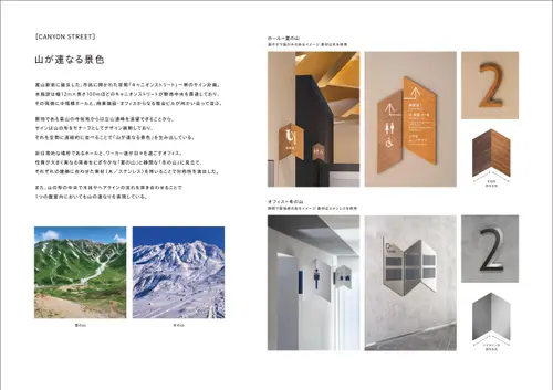 作品意図富山駅前の市民に開かれた空間「CANYON STREET」一帯のサイン。敷地を貫通する幅12m×100mの通路の両側に、中規模ホールと、商業施設・オフィスからなる複合ビルが向かい合って並ぶ。立山連峰を遠望できることからサインは山の形をモチーフとしており、空間に連続的に並べることで「山が連なる景色」を表現している。ホールを夏の山、オフィスを冬の山に見立てており、異素材を用いることで対称性を演出した。