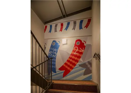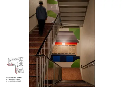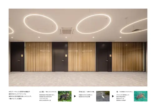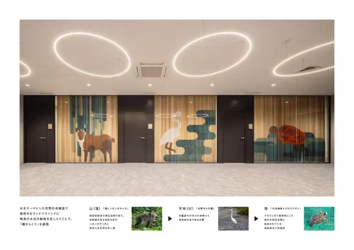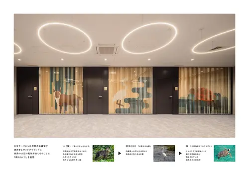受賞コメント100年近い歴史を持つ徳島信用金庫は、地域に根ざし、徳島とともに発展してきた。新本社ビルである当施設は、徳島の文化や自然をモチーフとした意匠が特徴である。サイン計画では、阿波農村舞台の「襖カラクリ」に着目し、連続する一枚板の構成によって、舞台の仕掛けのようなデザインを展開した。また、五円玉と同じ素材である真鍮を用い、企業カラーである赤い紐で結ぶことで、「ご縁」を大切にする企業理念を表現した。