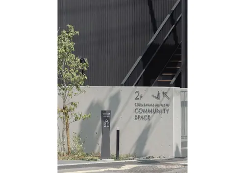 作品意図100年近い歴史を持つ徳島信用金庫は、地域に根ざし、徳島とともに発展してきた。新本社ビルである当施設は、徳島の文化や自然をモチーフとした意匠が特徴である。サイン計画では、阿波農村舞台の「襖からくり」に着目し、連続する一枚板の構成によって、舞台の仕掛けのようなデザインを展開した。また、五円玉と同じ素材である真鍮を用い、企業カラーである赤い紐で結ぶことで、「ご縁」を大切にする企業理念を表現した。