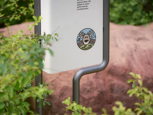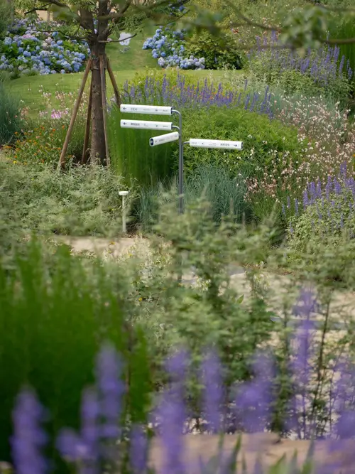 起伏ある湿地を探索する経路を、折れ曲がる鋼管の立体構造で比喩的に表現。地表から隆起するメタリックなラインが、隠れた生態系への道標となる。等高線図を三次元化したデザインが、自然地形と人工ナビゲーションの調和的共存を実現。来園者に地理的特徴を身体で感知させる仕掛けを施した。