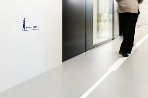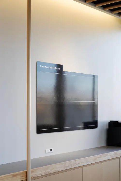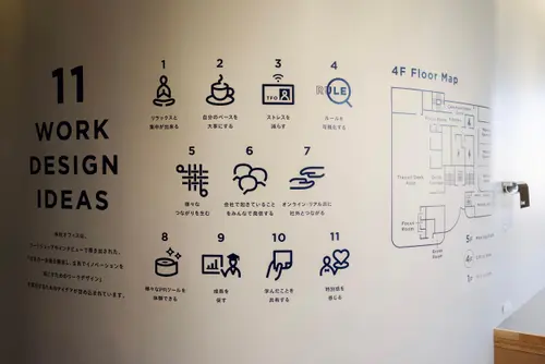 作品意図履物縫製業として事業を開始したテクノフローワンは、履物用ゴム糊引き加工を起源に、塗る・貼る(コーティング・ラミネート技術)をコア技術にして、現在ではさまざまな分野に貢献しています。本社のサイン計画では、プロジェクトの立ち上げ段階で実施したワークショップやインタビューから導き出された、「イノベーション」を起こすためのいくつもの「ワークデザインアイデア」が詰め込まれています。