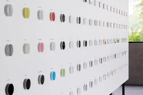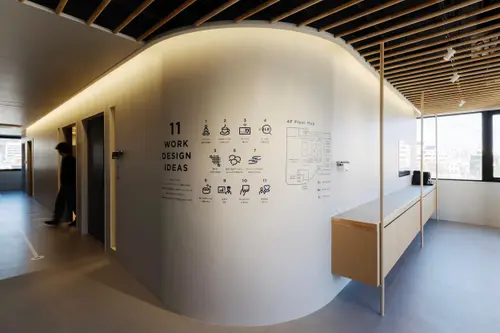 受賞コメント履物縫製業として事業を開始したテクノフローワンは、履物用ゴム糊引き加工を起源に、塗る・貼る(コーティング・ラミネート)をコア技術にして、現在では様々な分野に貢献している。今回の本社改修は、事前に実施したワークショップやインタビューから導き出された、いくつもの「ワークデザインアイデア」を実現すべく進められた。サイン計画では、エントランスの100種類のサンプルを手にとって比較できる製品展示や、自社製品を利用したサインなど、テクノフローワンの技術力や取り組みを社内外に発信するための仕組みが随所に詰め込まれている。