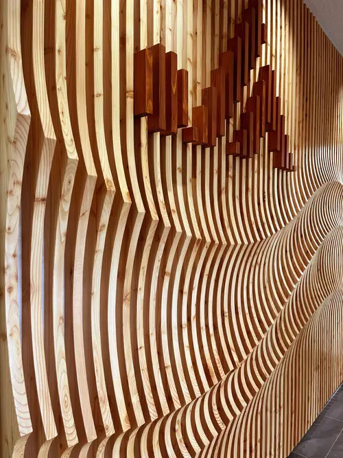 作品意図北海道十勝地方、本別町は林業と農業が基幹産業で、畑作においては「日本一の豆のまち」と呼ばれています。 その農業を支える組合施設として、地産のカラマツ材と豆を使用し壁面アートワークを設えました。 カラマツ材アートは十勝の田園風景に吹き渡るそよ風を表現。 豆アートは豆があふれて零れ落ちる様を表現しました。