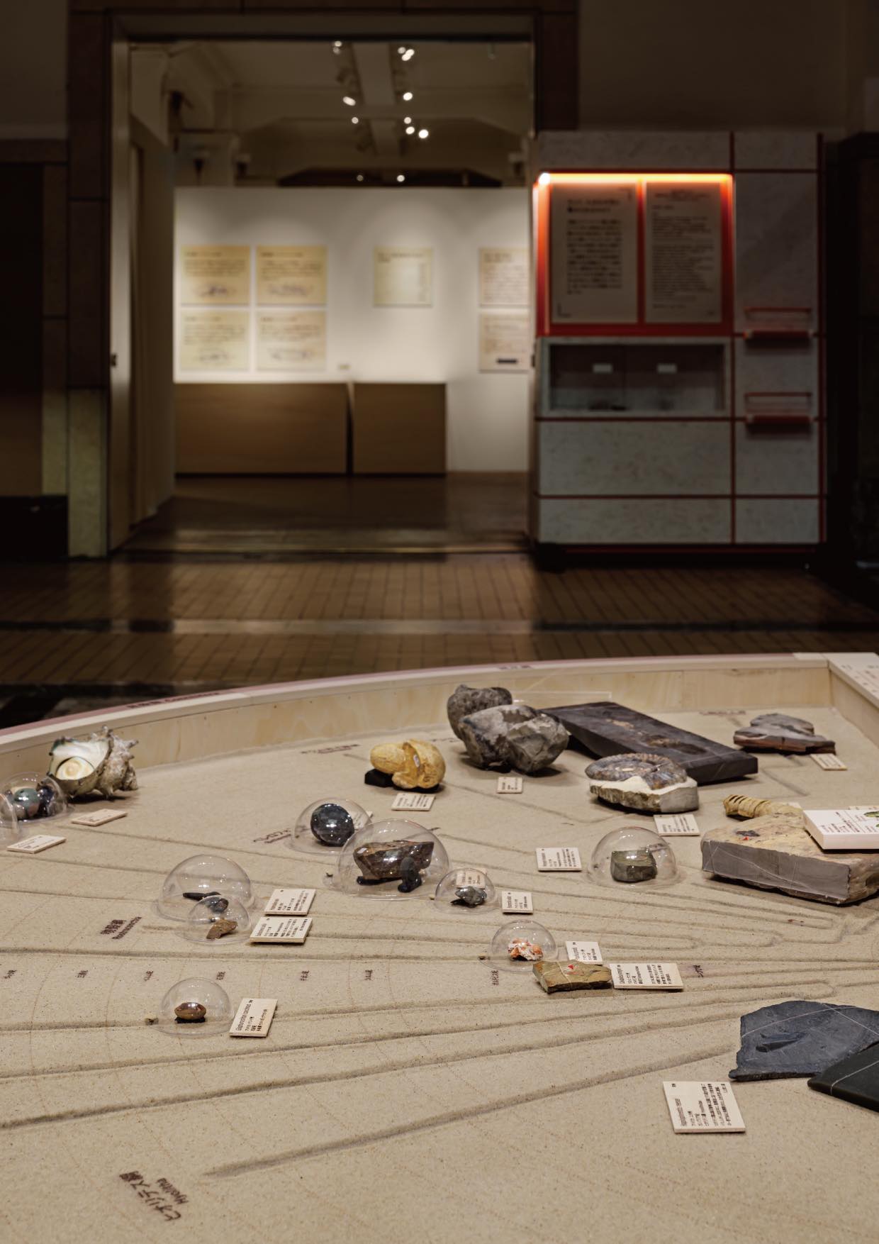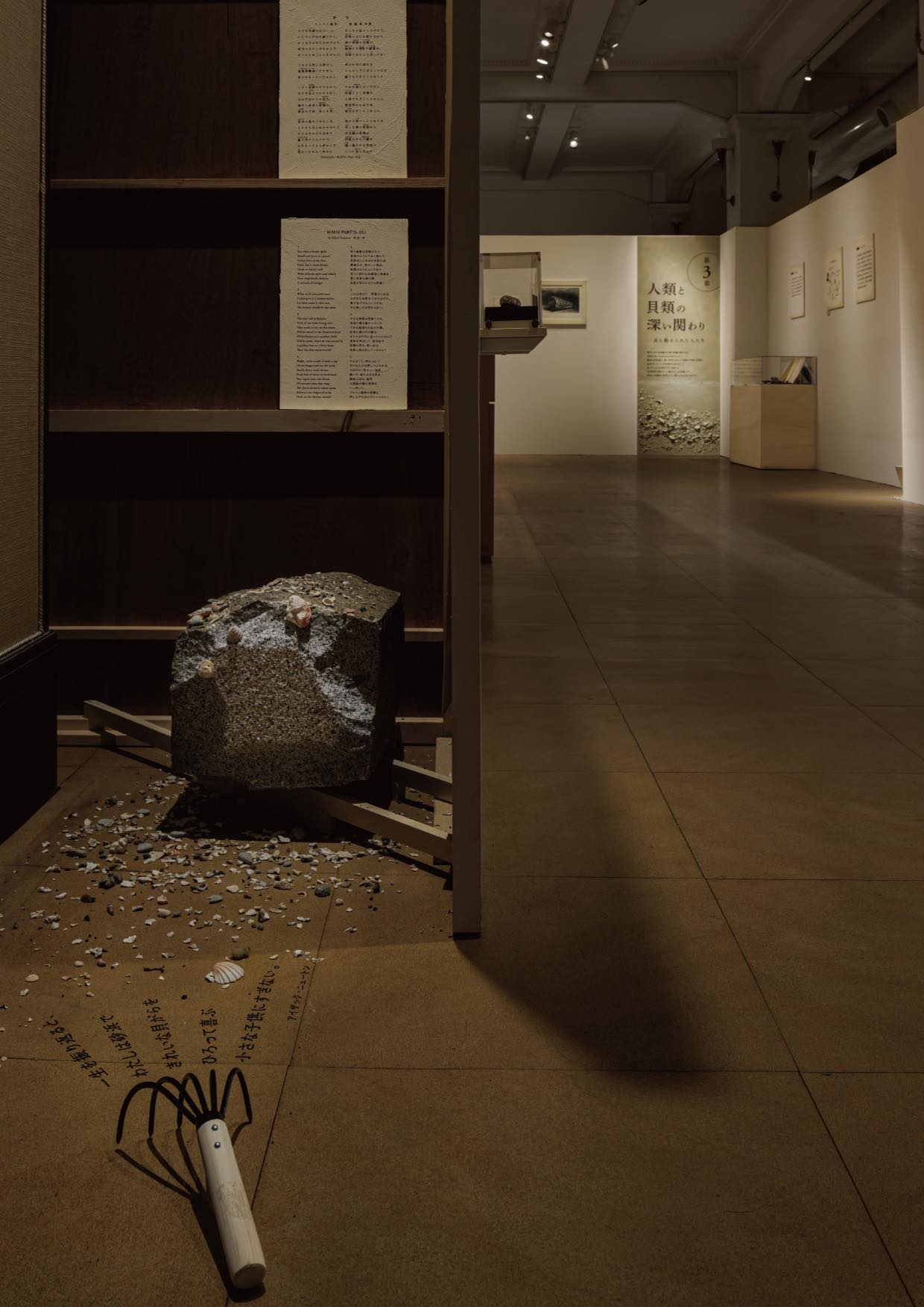 作品意図貝類は太古から人類の生活や文化を支えてきた。本展示は貝類の多様な姿を紹介するとともに、そうした人との関わりを伝えることを目的としていた。そこで貝と人との営みをデザインのテーマに据え、キーとなる展示物のマテリアルに貝殻を形成する炭酸カルシウムを使用。また各章のサインや進化の系統樹、貝の名言紹介に「人の手の痕跡を感じるデザイン」を施し、展示空間そのものが意味性を持って来場者に語りかける環境を目指した。