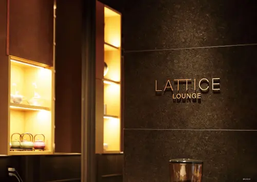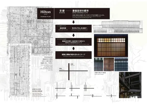 作品意図ヒルトン京都 サイン計画 京都 - 碁盤目状の都市、京都の歴史は延暦13年(794年)の平安京遷都にはじまる サイン計画のコンセプト、温故知新 - 京のもてなしを未来へ サインデザインの方向性、碁盤目状の都市、伝統的格子の意匠からSIMPLE で MODERN なイメージ 縦軸と横軸の組み合わせイメージ 素材:外部/伊達冠石、内部/真鍮加工、真鍮レーザーカットブロンズ仕上げ