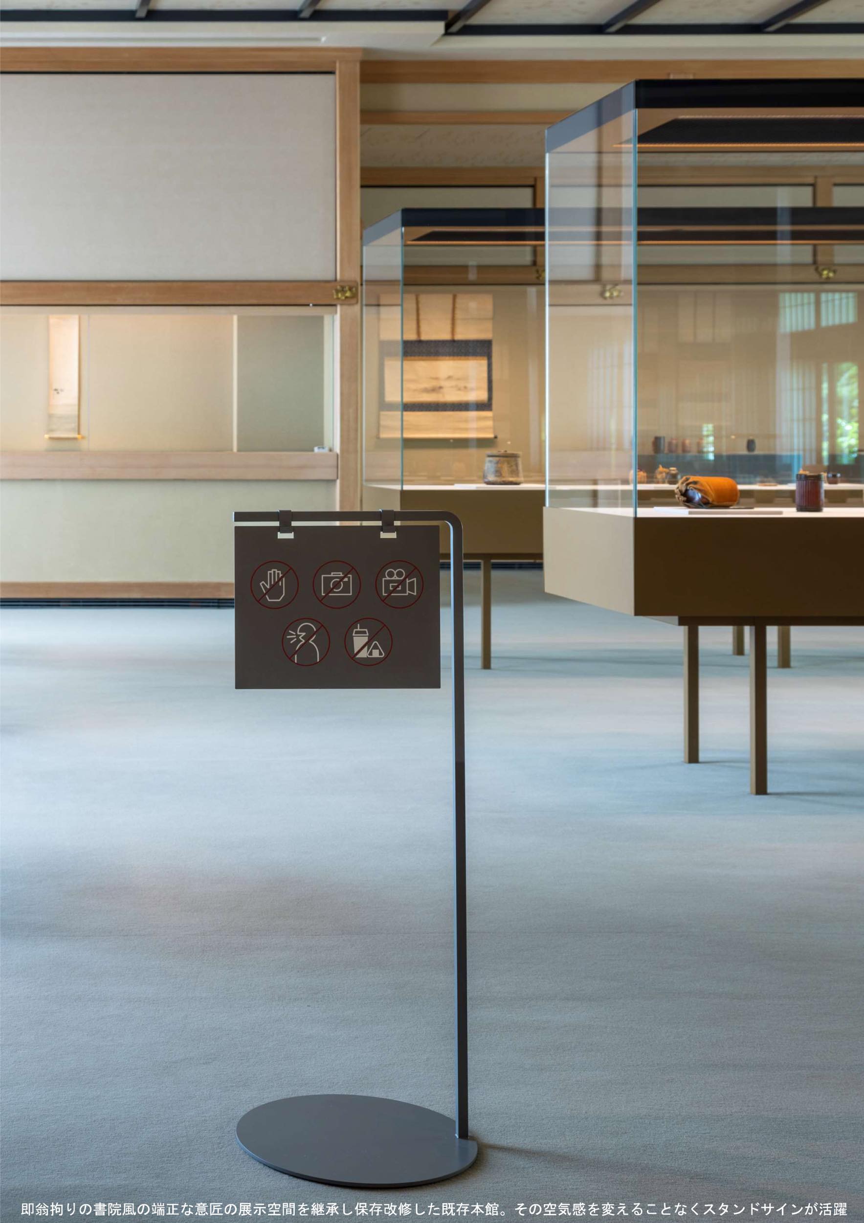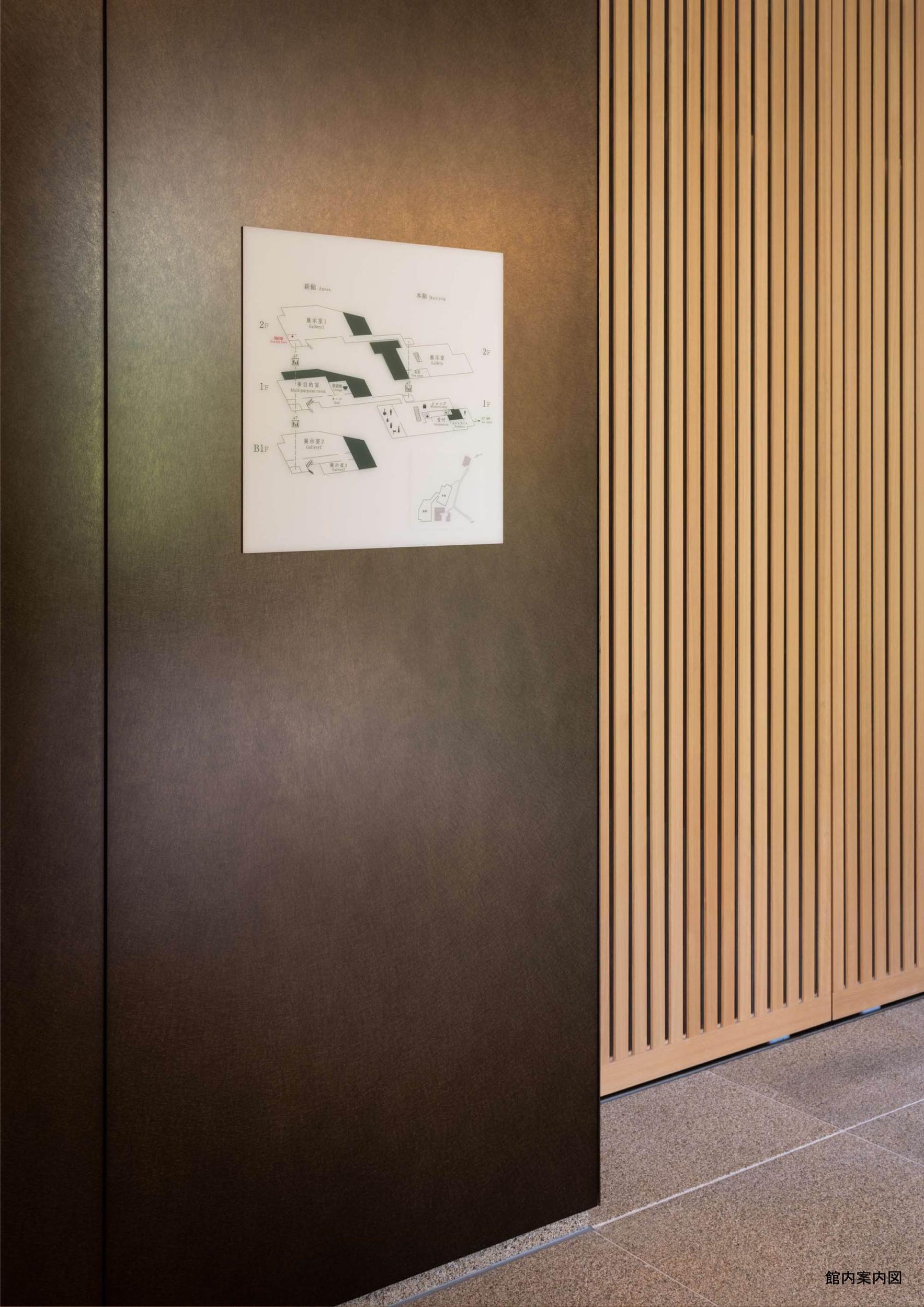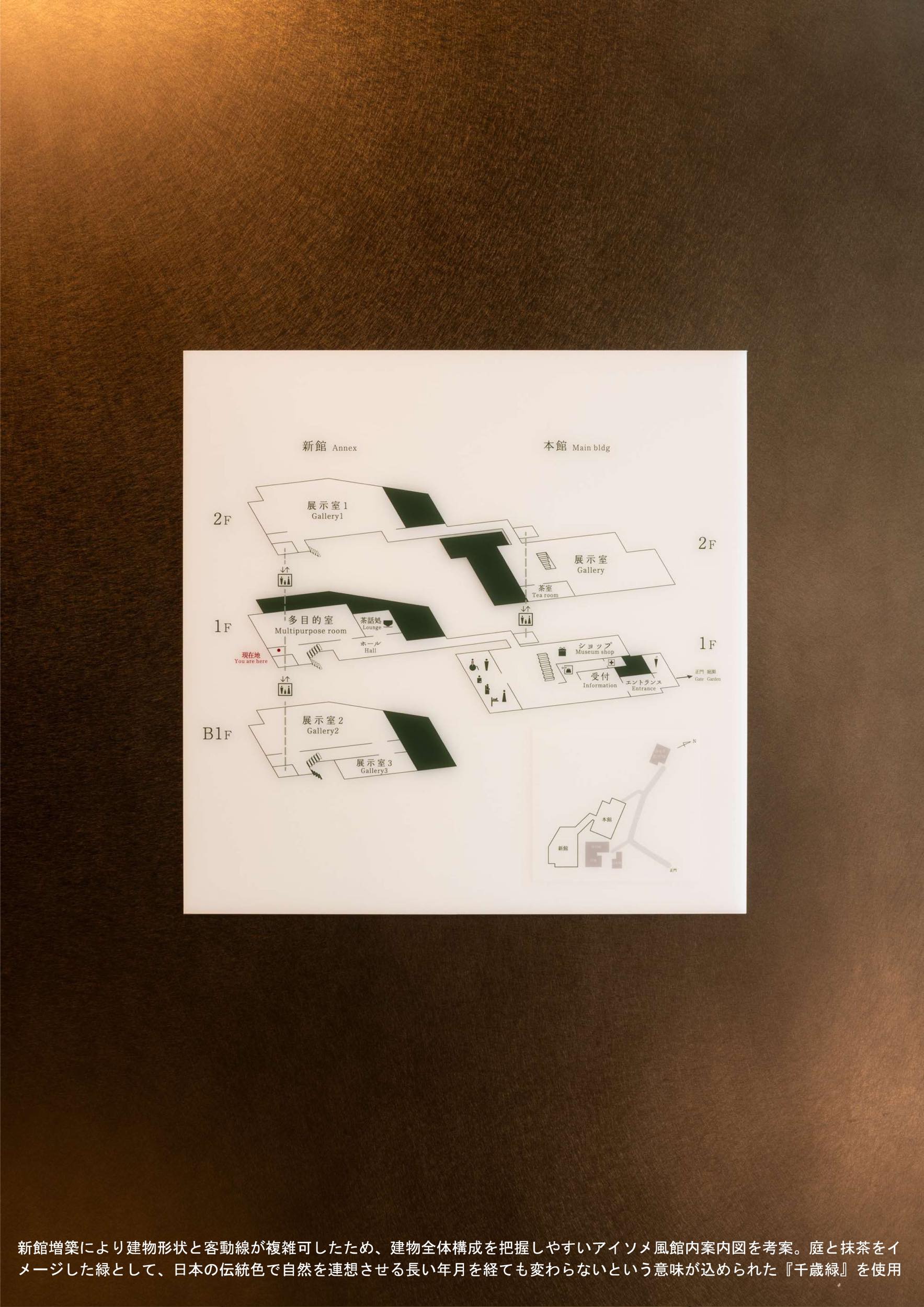 作品意図実業家・畠山一清(即翁)が創設した美術館の保存改修増築。茶の湯にまつわる収蔵品を多くの人と共に楽しむ伝統を受け継ぎ、茶室を設えた唯一無二の本館の改修と新館増築では、即翁の筆文字サインや手紙文を活かしてロゴやサインを製作、既存茶室欄間の文様を用いた内装など即翁の拘りを磨き上げた。更に美術館運営をフレキシブルにサポートするサインシステムを考案、歴史を継承したサインと美術館が育てるサインが未来へと繋ぐ。