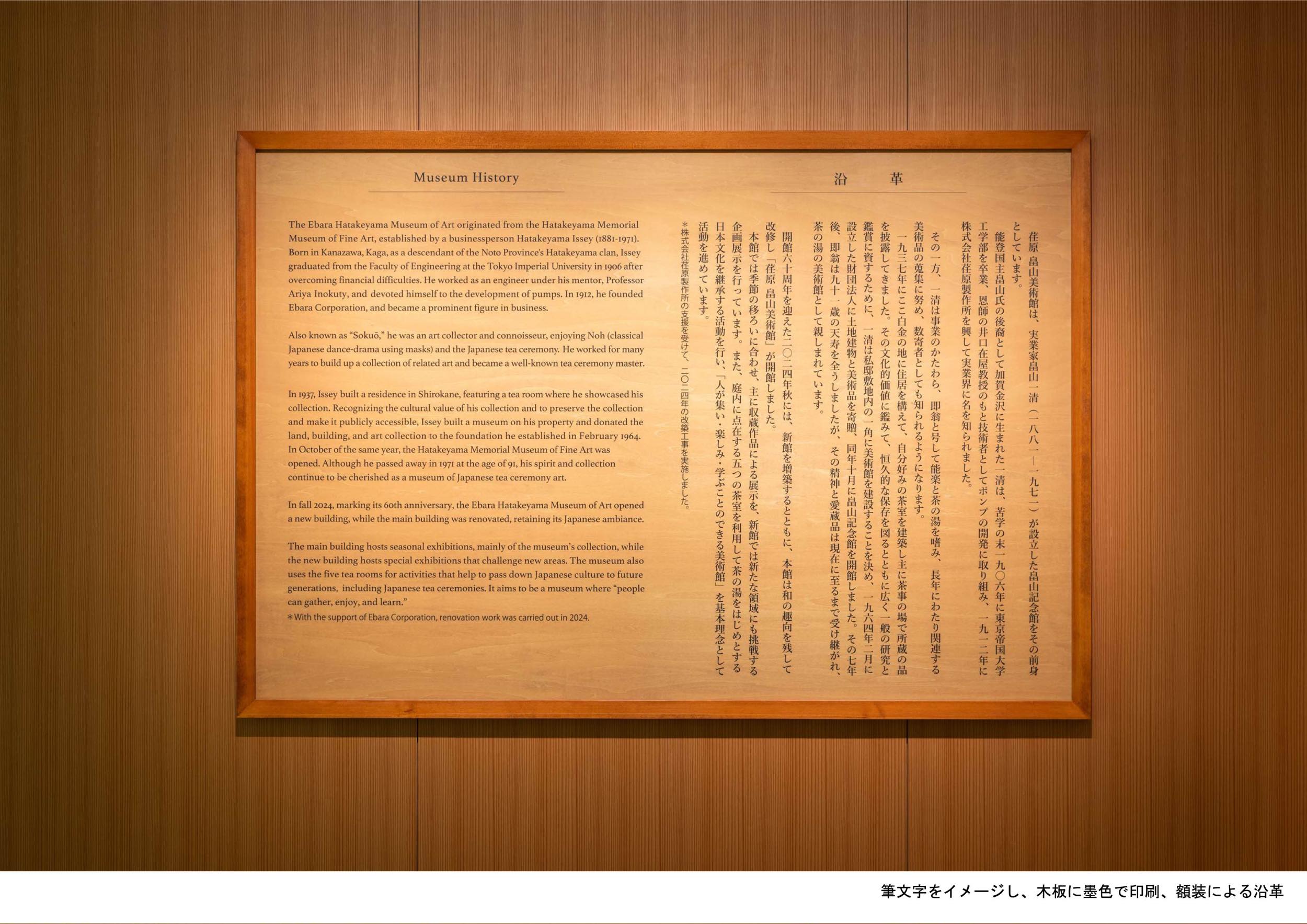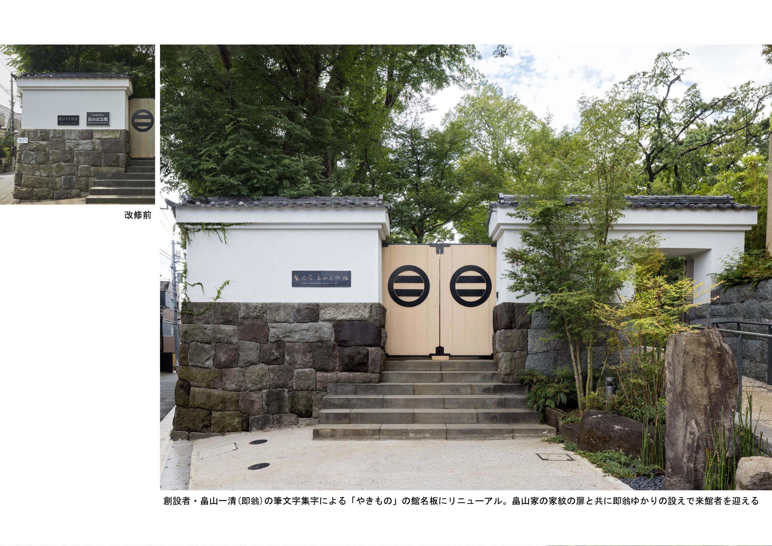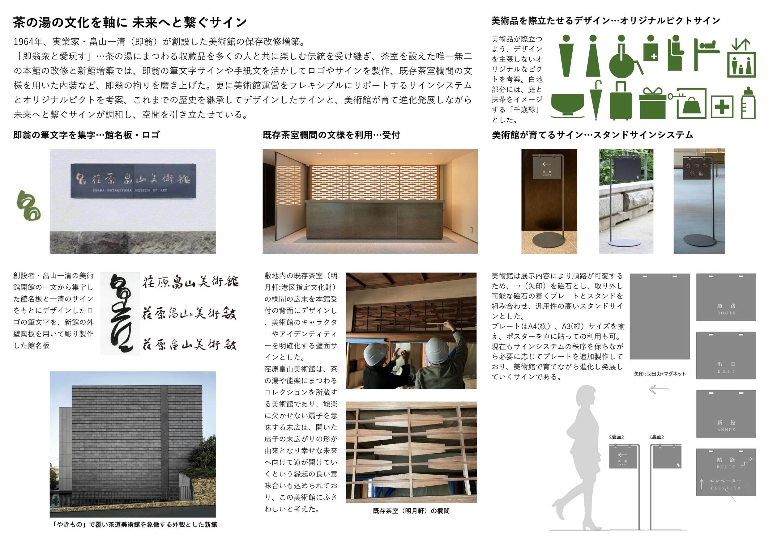 作品意図実業家・畠山一清(即翁)が創設した美術館の保存改修増築。茶の湯にまつわる収蔵品を多くの人と共に楽しむ伝統を受け継ぎ、茶室を設えた唯一無二の本館の改修と新館増築では、即翁の筆文字サインや手紙文を活かしてロゴやサインを製作、既存茶室欄間の文様を用いた内装など即翁の拘りを磨き上げた。更に美術館運営をフレキシブルにサポートするサインシステムを考案、歴史を継承したサインと美術館が育てるサインが未来へと繋ぐ。