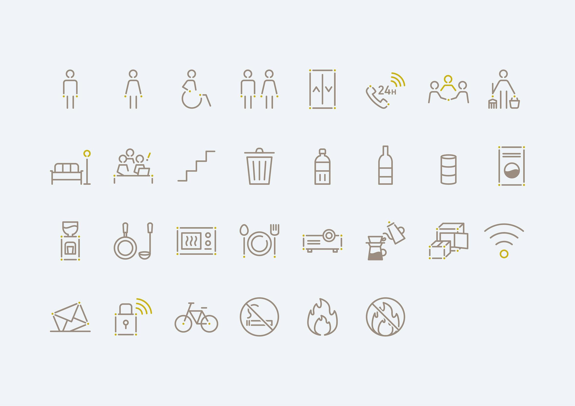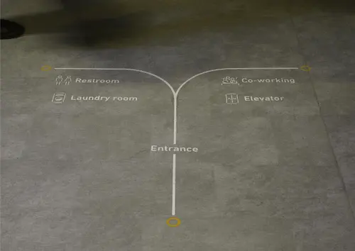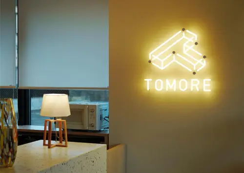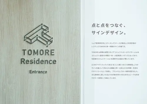 作品意図シェア型賃貸住宅とコワーキングスペースが融合した住宅形態のレジデンスTOMORE 第一号館のサイン計画です。ロゴのアイデンティティである「点(人)と線(つなぐ)の関係性」こそがサイン計画として求められる機能と同一と捉えロゴの特徴・形状をデザインコードとして採用し、ブランドとしての一体感を図りました。また直感的に楽しくなるような印象を持たせるためのユニークな形状やカラーを選定して演出しています。