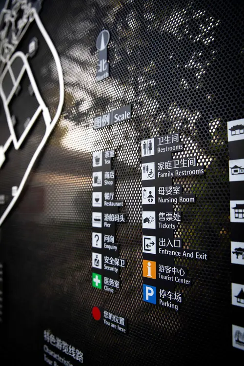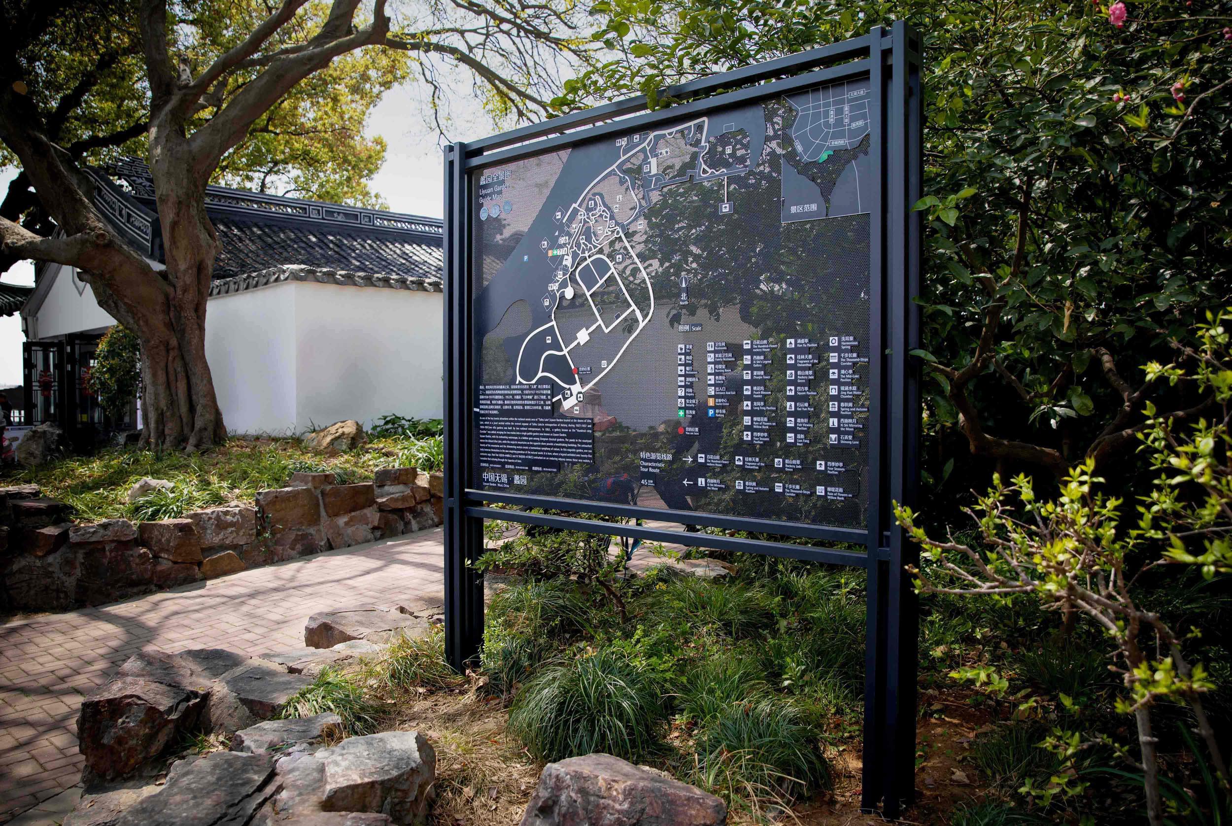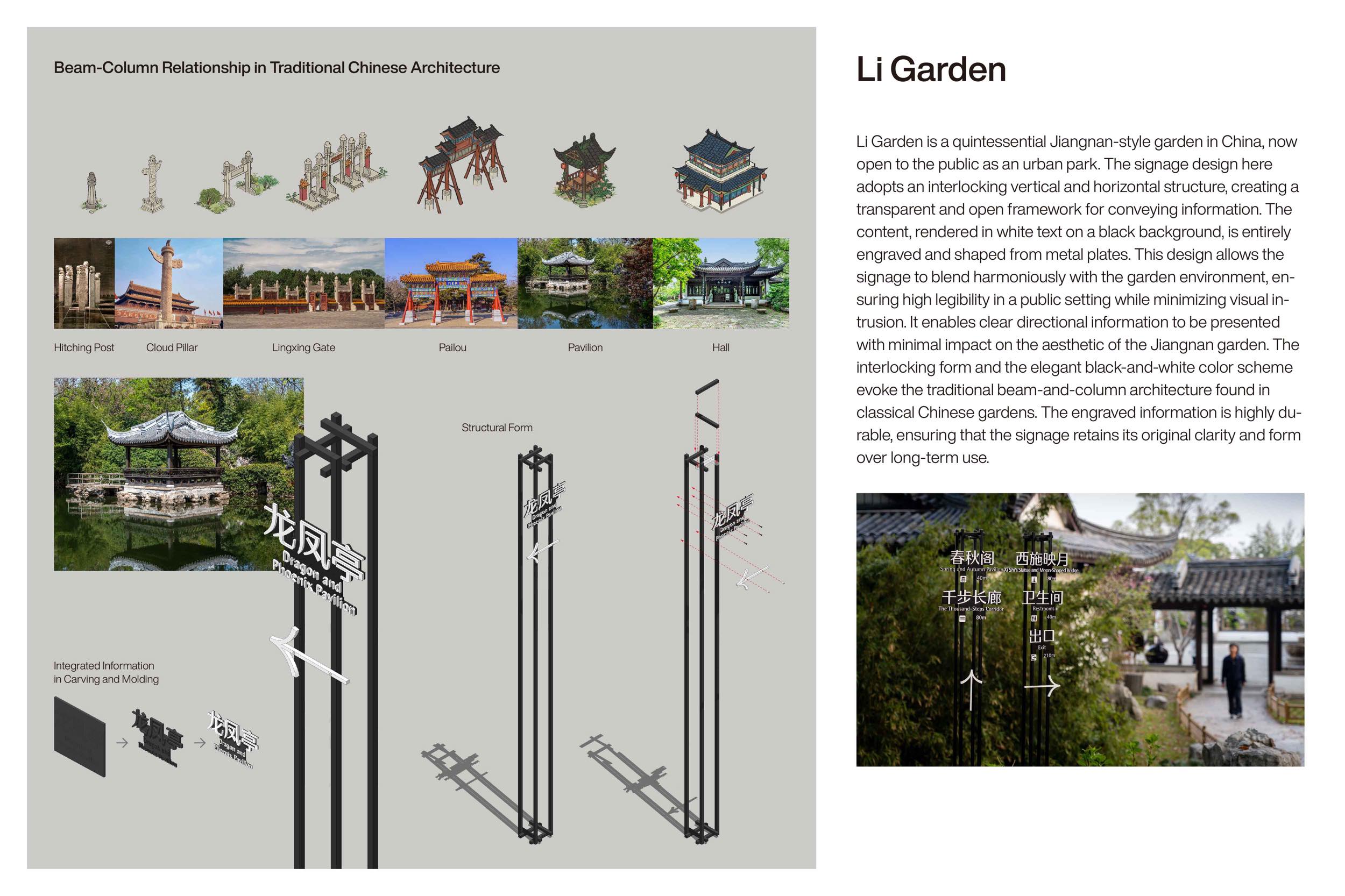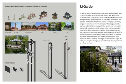 作品意図Li Garden, a classic Jiangnan-style garden now open as an urban park.Its signage features an interlocking vertical and horizontal structure, white text on black metal plates, its shape and color echo the traditional Jiangnan garden architecture.. Fully engraved for durability, the signage integrates with the landscape, ensuring clarity while minimizing visual impact, balancing function and beauty
