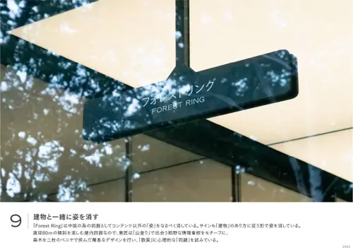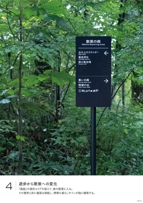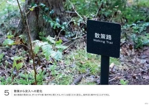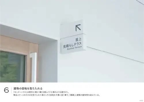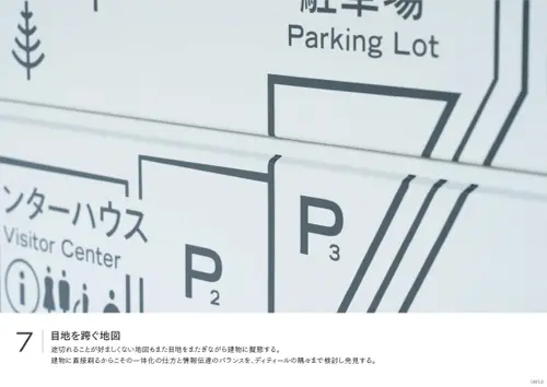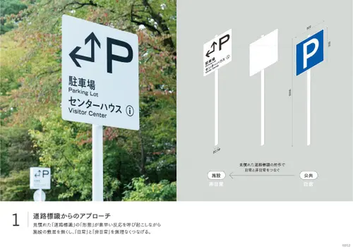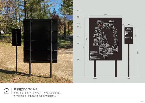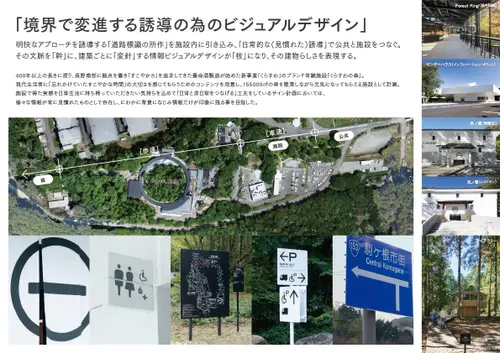 作品意図長野南部に拠点を持ち400年以上すこやかさを追求してきた養命酒製造の新事業くらすわのブランド体験施設。日常生活で忘れかけていた「すこやかな時間の過ごし方」を実感し持ち帰ってもらう事を目的とした施設の為、サインのコンセプトを「日常と非日常を自然につなげるサイン」とした。施設に到着するまでに車窓から見る「標識」の印象を模写し外構サインのフォーマットにそれぞれの建築にはその印象が擬態するデザインを配した