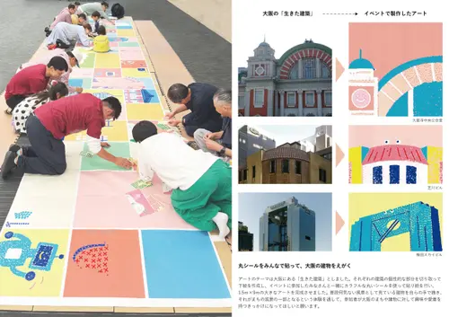 作品意図真っ白な工事現場の仮囲いに、みんなで多様な色の丸いシールを貼って大阪のまちを描き、御堂筋を彩りました。2024年生きた建築ミュージアムフェスティバル大阪において参加型ワークショップによるシールアート製作を行い、建設中の仮囲いの一部とすることで、みんなで作るパブリックアートへと昇華させました。アートは大阪のまちをテーマとして描き、参加者にまちへの愛着をもってもらうことを目指しました。