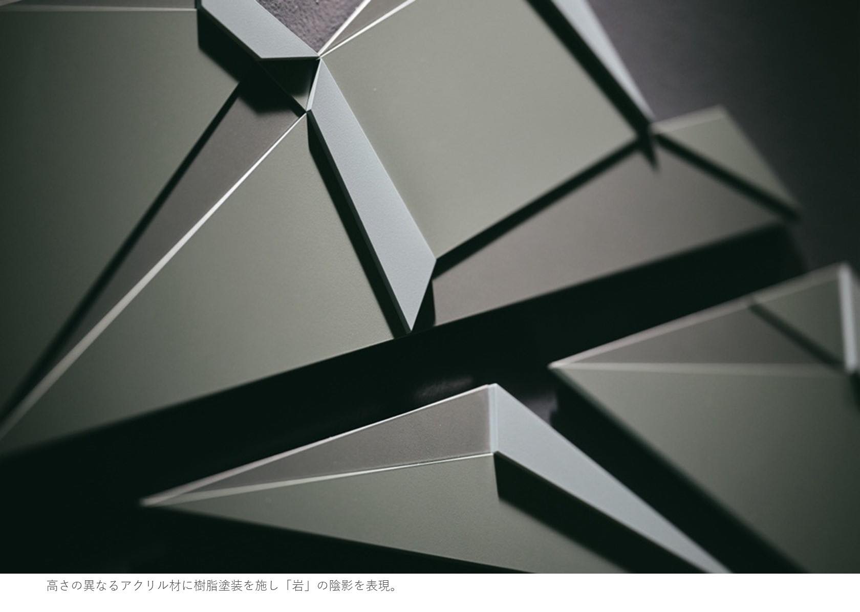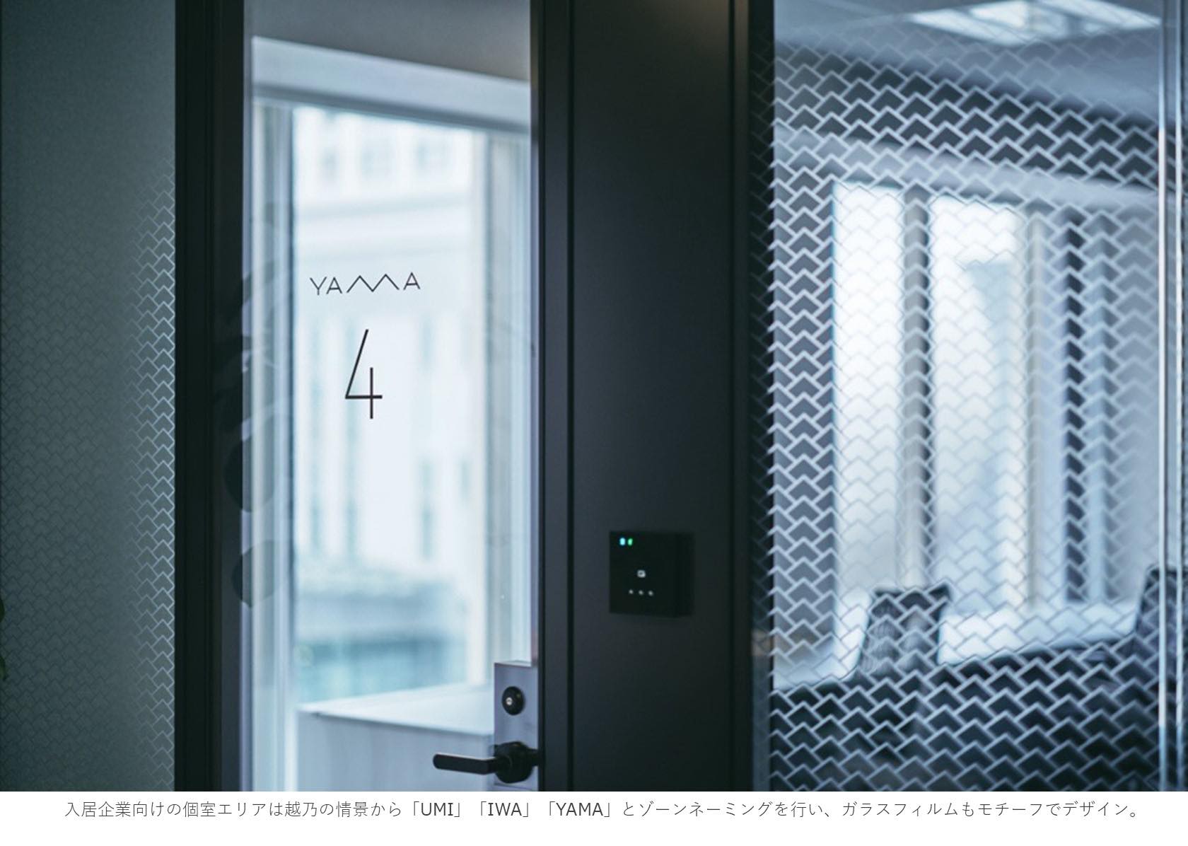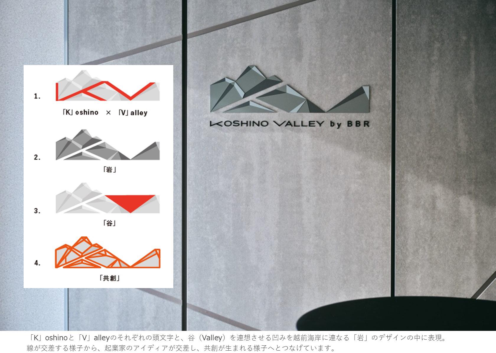 作品意図『越乃バレー』というネーミングには、福井県の山や海に囲まれた谷あいの街「越乃」から、多くのイノベーションを起こすという期待が込められています。日本海や越前海岸のゴツゴツした岩、連なる山々など、越乃の情景をモチーフとしたデザイン要素を散りばめることで、起業家同士が切磋琢磨しながら新たなビジネスが生まれ、福井を代表する企業を創出する。施設の強い想いが込められています。