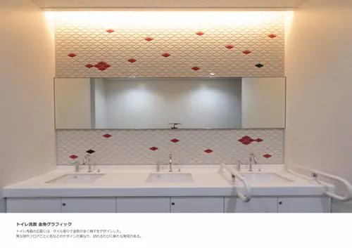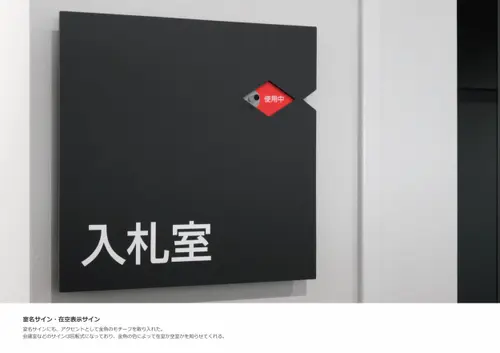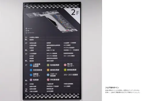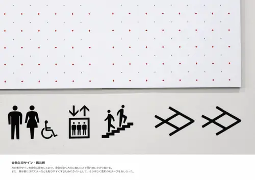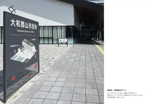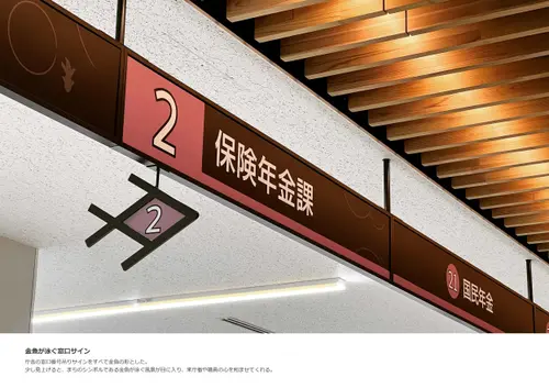 金魚の日本三大産地のひとつである奈良県大和郡山市における庁舎のサイン計画である。大和郡山市の市章「郡山花菱」の菱形をモチーフに金魚をアイコン化し、サインデザインへと展開した。まちのシンボルである菱形と金魚を建物内外のあらゆる場所に施すことで、庁舎がより身近に感じられ、市民の愛着を育む計画とした。
