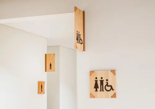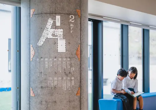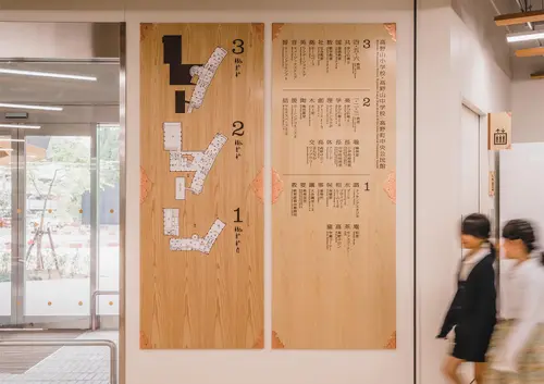 高野山に建てられた、小中学校・公民館・こども園を擁する複合施設のサイン計画です。サインのベースの木材には、高野山の寺院の修繕用材として保護育成されている「高野六木」の樹種(杉・桧・高野槙・樅・栂・赤松)を使用し、実際に仏具に使用されている錺金具を組み合わせました。高野山ならではの素材に、普段の学校生活のなかで触れられるサイン計画としました。