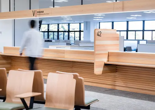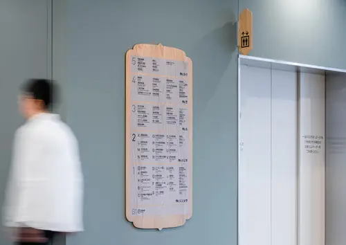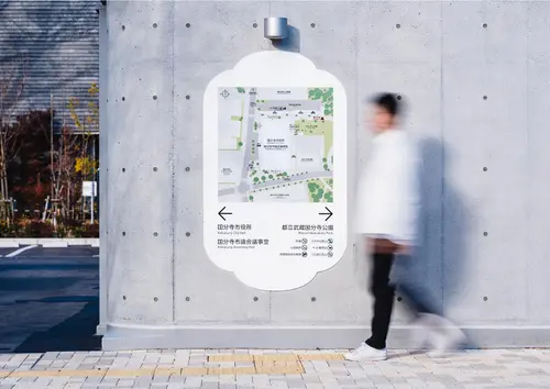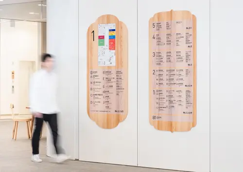 国分寺市役所新庁舎のサイン計画。天平13年、聖武天皇が鎮護国家を祈念して、建立を命じた国分寺。寺院や国分寺に伝わる七重塔のモチーフをサインに取り入れている。建築で多く使用されている木をサインにも使い、空間と一体化したサインとしている。