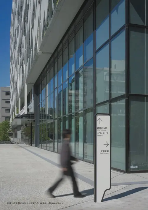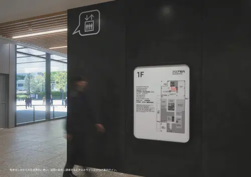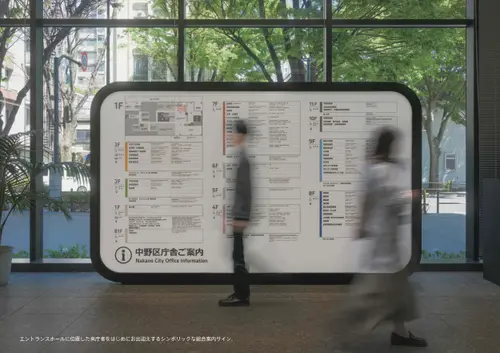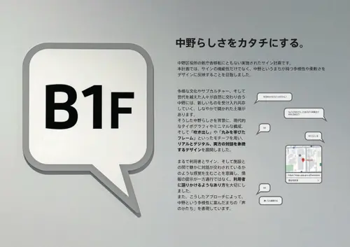 多様な文化や世代が交わる中野の柔軟で開かれた魅力を、サインデザインに反映。中野らしさを体現する現代的なタイポグラフィに加え、吹き出しや丸みのあるフレームによって、リアルとデジタルの対話を象徴。情報が一方通行でなく語りかけるような表現となるよう工夫し、中野というまちの「声のかたち」を描いている。