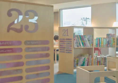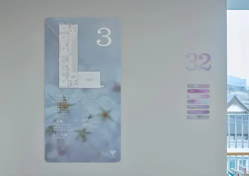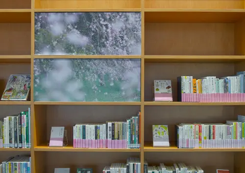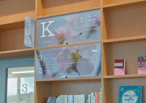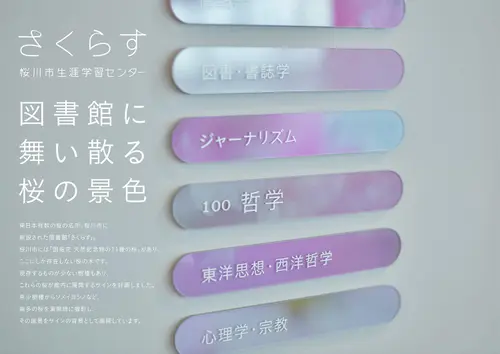 作品意図図書館に舞い散る桜の景色 東日本有数の桜の名所、桜川市に新設された図書館「さくらす」。桜川市には「国指定 天然記念物の11種の桜」があり、ここにしか存在しない桜の木です。現存するものが少ない樹種もあり、これらの桜が館内に展開するサインを計画しました。希少樹種からソメイヨシノなど、幾多の桜を満開時に撮影し、その風景をサインの背景として展開しています。