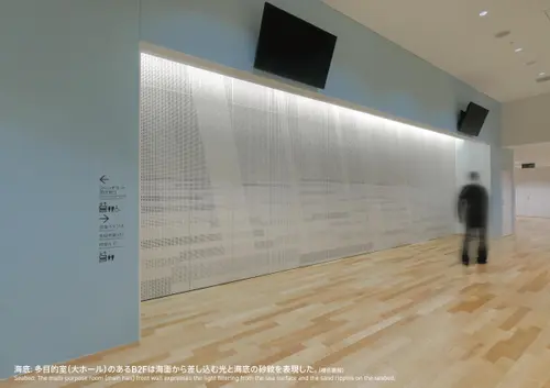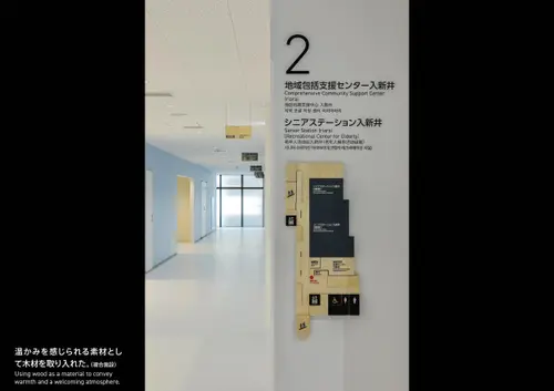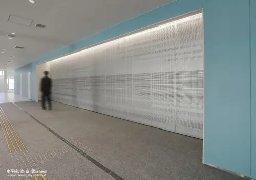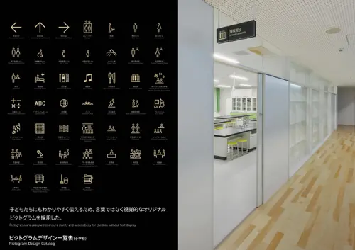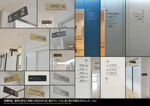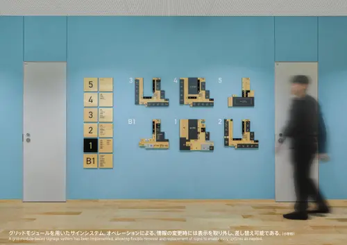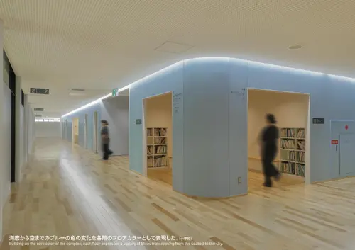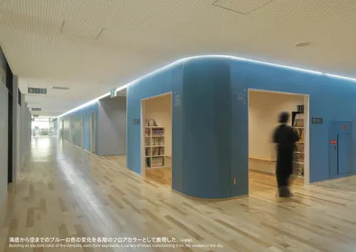 作品意図大森は昔から海苔養殖などの漁業で栄え、今も臨海地域は多様な産業と結びついている。本施設は、大森の「海」と羽田空港に象徴される「空」を環境グラフィックとフロアカラーで表現することにより、地域のアイデンティティを呼び起こし、子どもたちの夢や区民の希望を育む場として相応しい空間づくりを目指した。