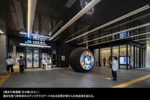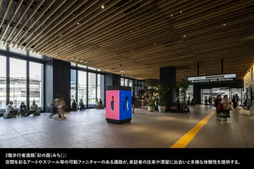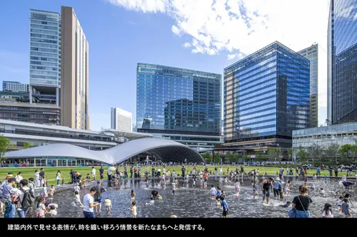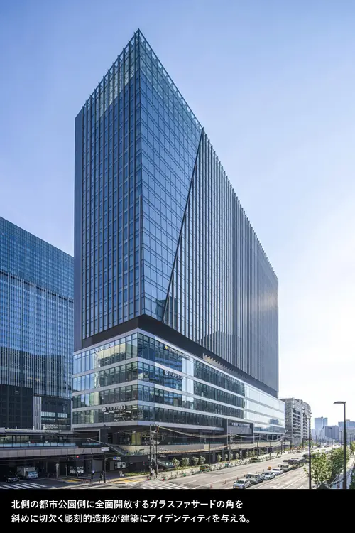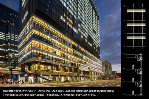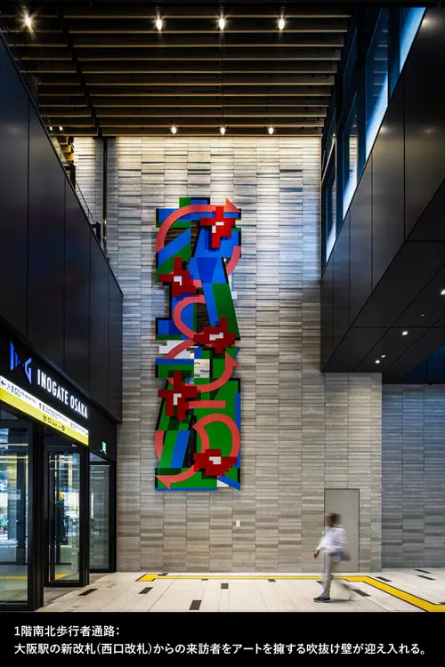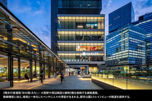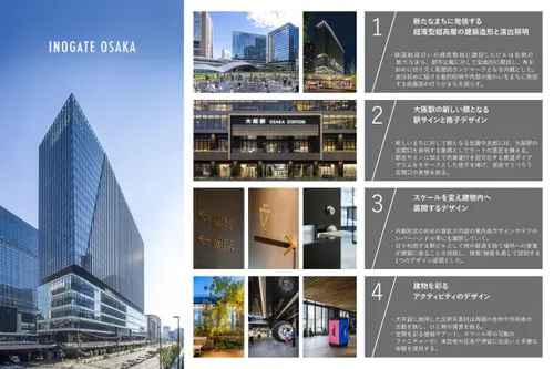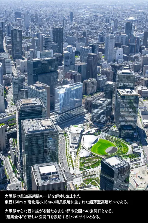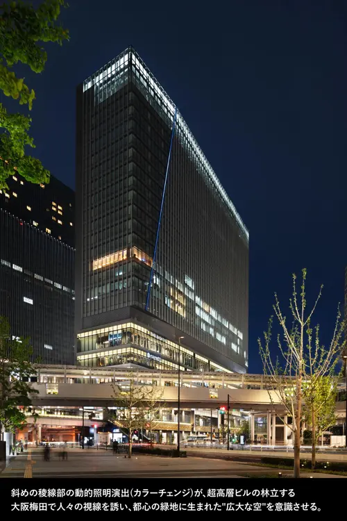 作品意図大阪駅の駅ビルとして建設された超薄型高層建築であり、建築自体が新たな玄関口を表明する1つのサインである。内部の公共通路や飲食の賑わいを新たなまちへ発信する。顔となる中央に掲げる駅名サインと格子デザインは昼夜でうつろう表情を創る。外観の斜めのラインはスケールを変えて内部サインへと展開する。建築材料に映る人々の活動や周辺自然、植栽、アート、家具が空間を彩り、未来に向かって「時を纏う」駅ビルを目指した。