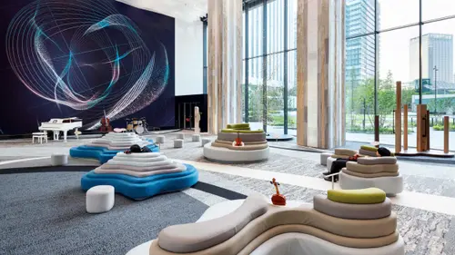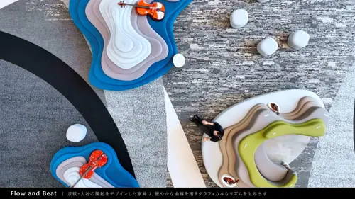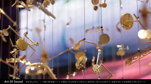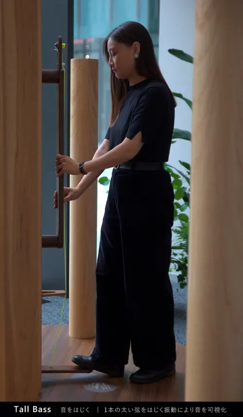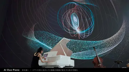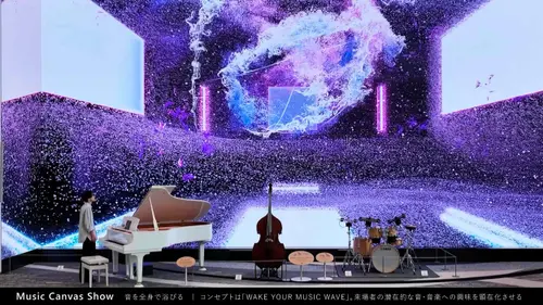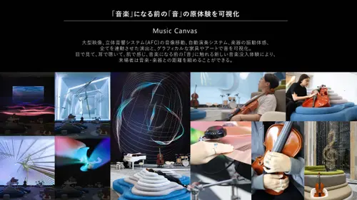 作品意図顧客拡充を目的として、楽器未経験者が音楽・楽器との距離を縮めるヤマハのブランド体験拠点。「Music Canvas」という音楽没入体験エリアでは、大型映像、立体音響システムの音像移動、自動演奏システム、楽器の振動体感の全てを連動させた演出と、グラフィカルな家具やアートで音を可視化。目で見て、耳で聴いて、肌で感じ、音楽になる前の「音」に触れ、来場者の潜在的な音楽への興味を顕在化させる。